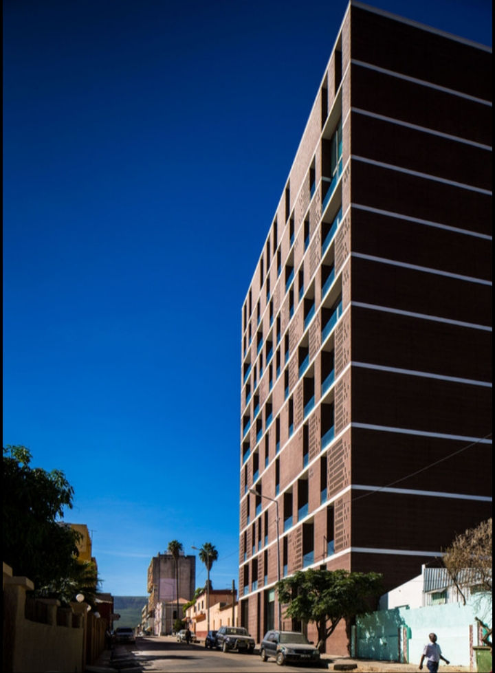 Le concept de construction repose sur un principe de robustesse qui devrait permettre à ce bâtiment solide et simple de garantir confort, durabilité et maintenance réduite. Le module de balcons encastrés fournit l’ombrage naturel résultant de sa profondeur, en plus d’un compartiment technique de façade accessible et ventilée. La masse des murs de maçonnerie est interrompue par les données des dalles de béton, qui fonctionnent comme un linteau continu. Cette expression tectonique est renforcée par la matérialité de la maçonnerie posée en parcours «soldat et civière», évoquant les riches textures et couleurs de la terre et de la poterie africaines.
